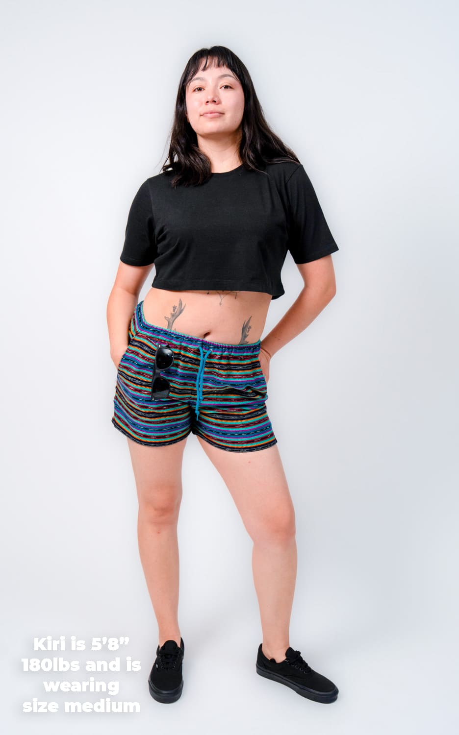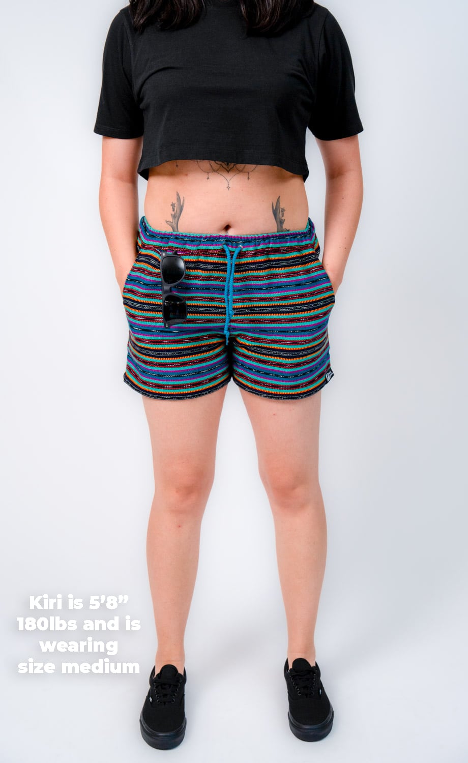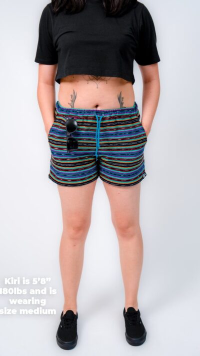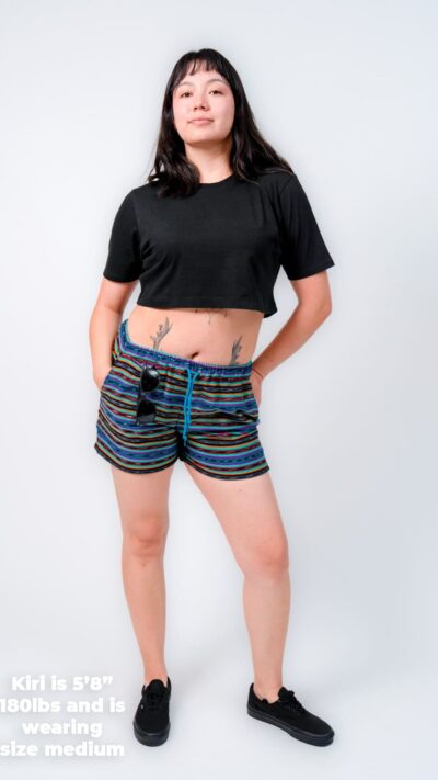 They’re designed with a relaxed, gender-neutral fit. The elastic waistband with drawstring makes them flexible for a wide range of bodies. Whether you’re tall, curvy, lean, or in between, these handwoven adventure shorts move with you. Check our sizing chart for exact measurements.