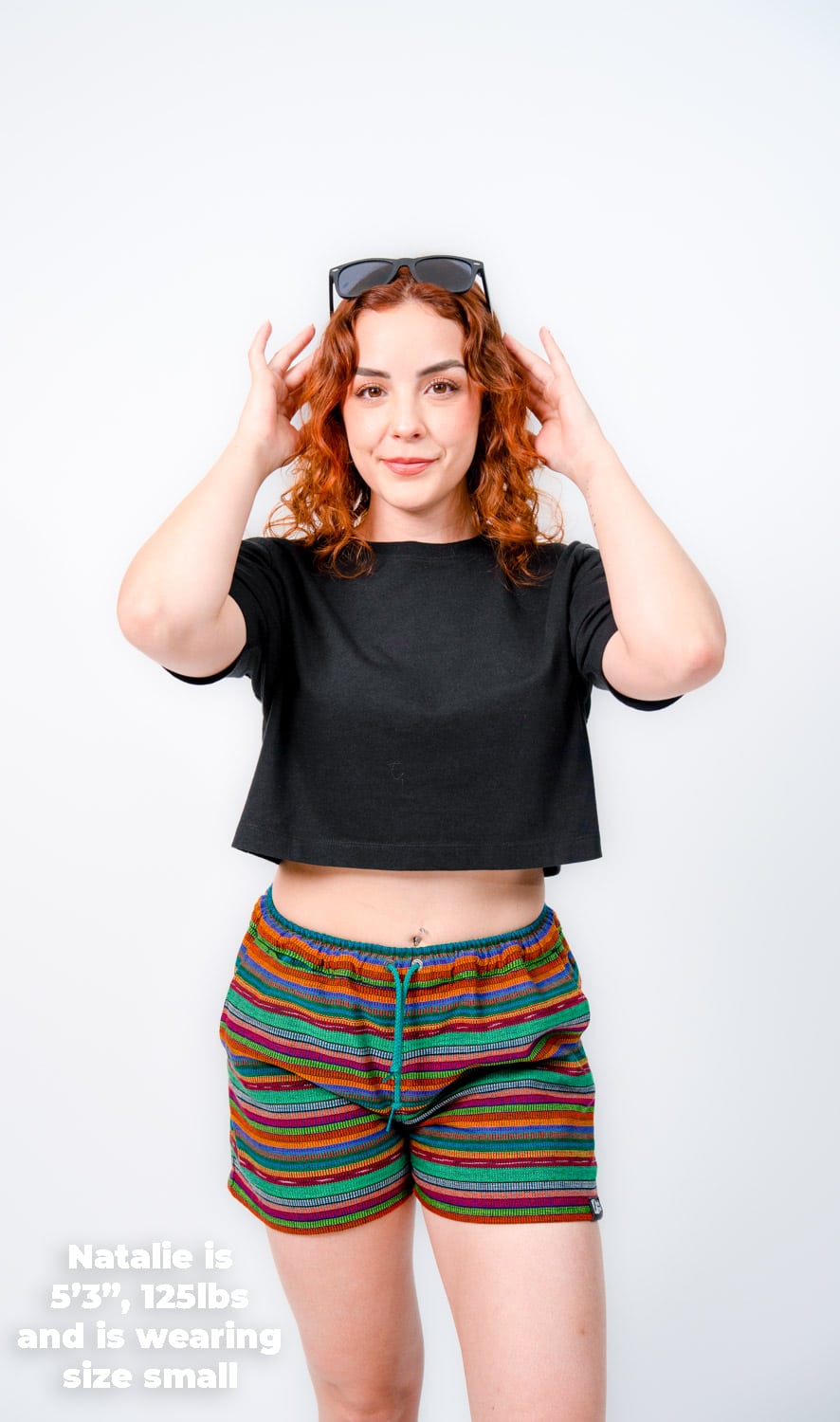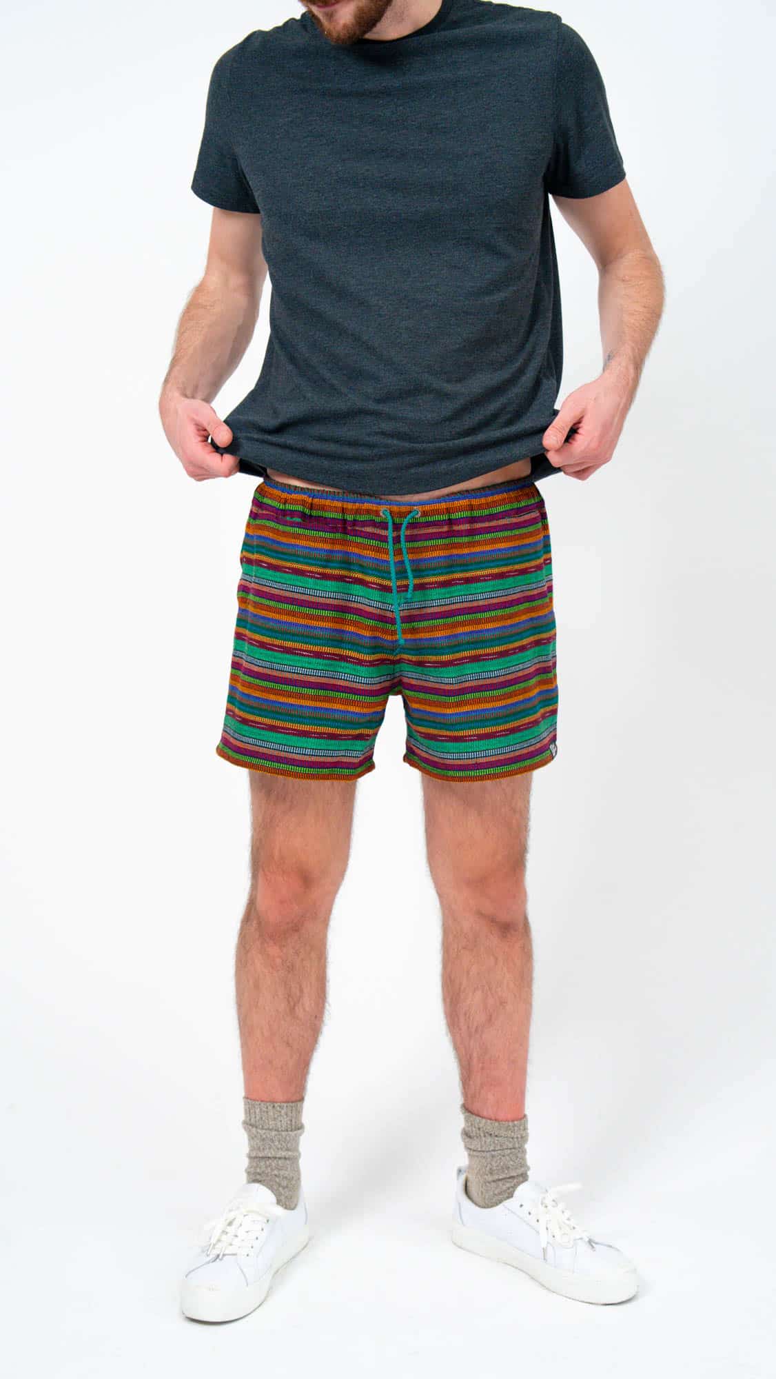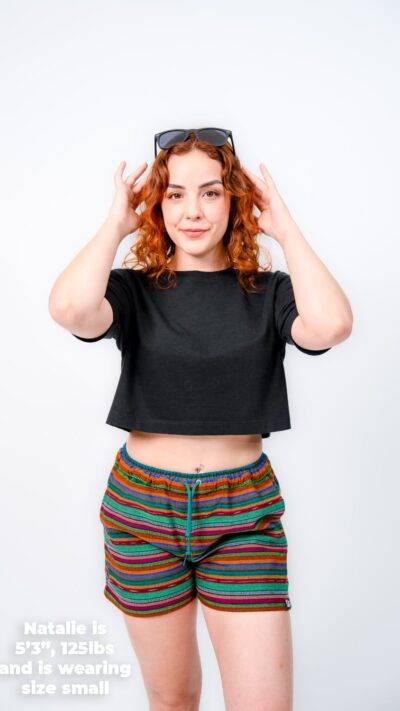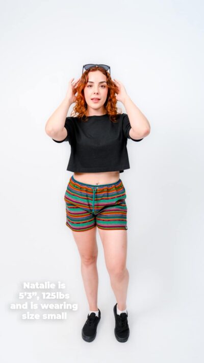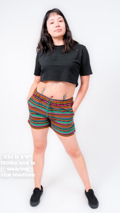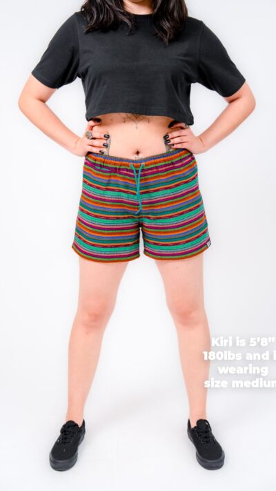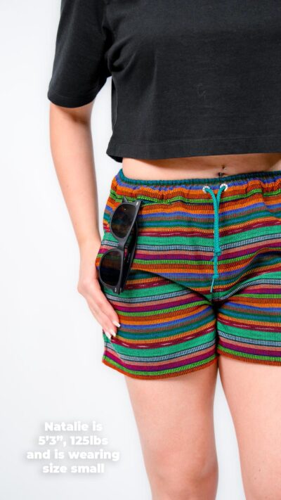 They’re designed with a relaxed, gender-neutral fit. The elastic waistband with drawstring makes them flexible for a wide range of bodies. Whether you’re tall, curvy, lean, or in between, these handwoven adventure shorts move with you. Check our sizing chart for exact measurements.