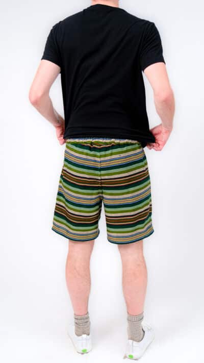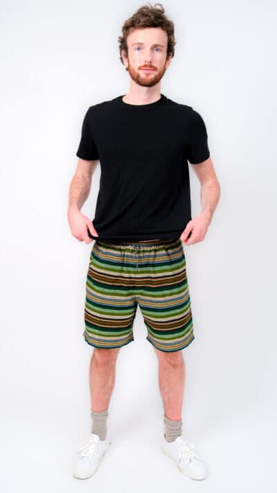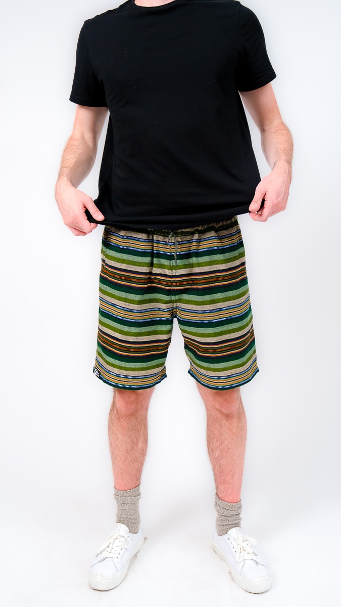 They’re designed with a relaxed, gender-neutral fit. The elastic waistband with drawstring makes them flexible for a wide range of bodies. Whether you’re tall, curvy, lean, or in between, these handwoven adventure shorts move with you. Check our sizing chart for exact measurements.