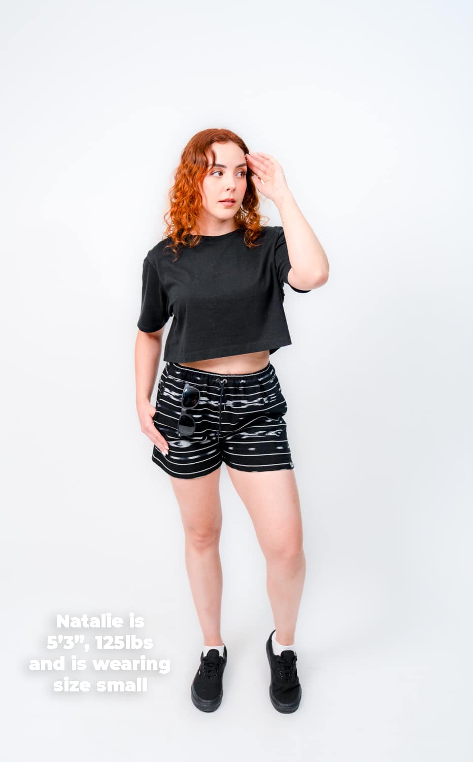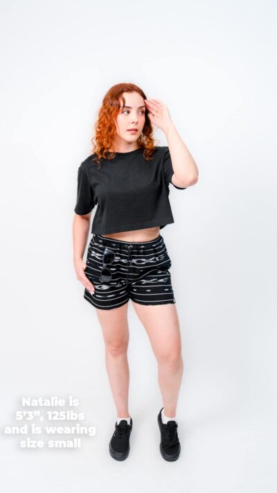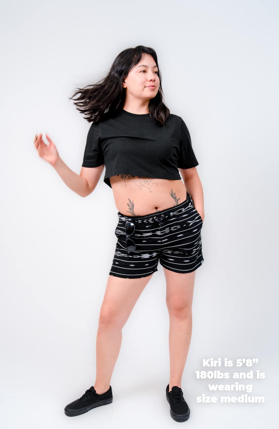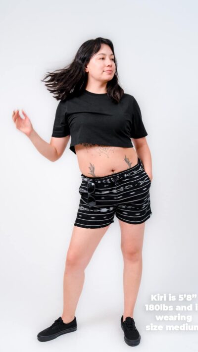 They’re designed with a relaxed, gender-neutral fit. The elastic waistband with drawstring makes them flexible for a wide range of bodies. Whether you’re tall, curvy, lean, or in between, these handwoven adventure shorts move with you. Check our sizing chart for exact measurements.