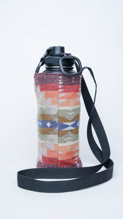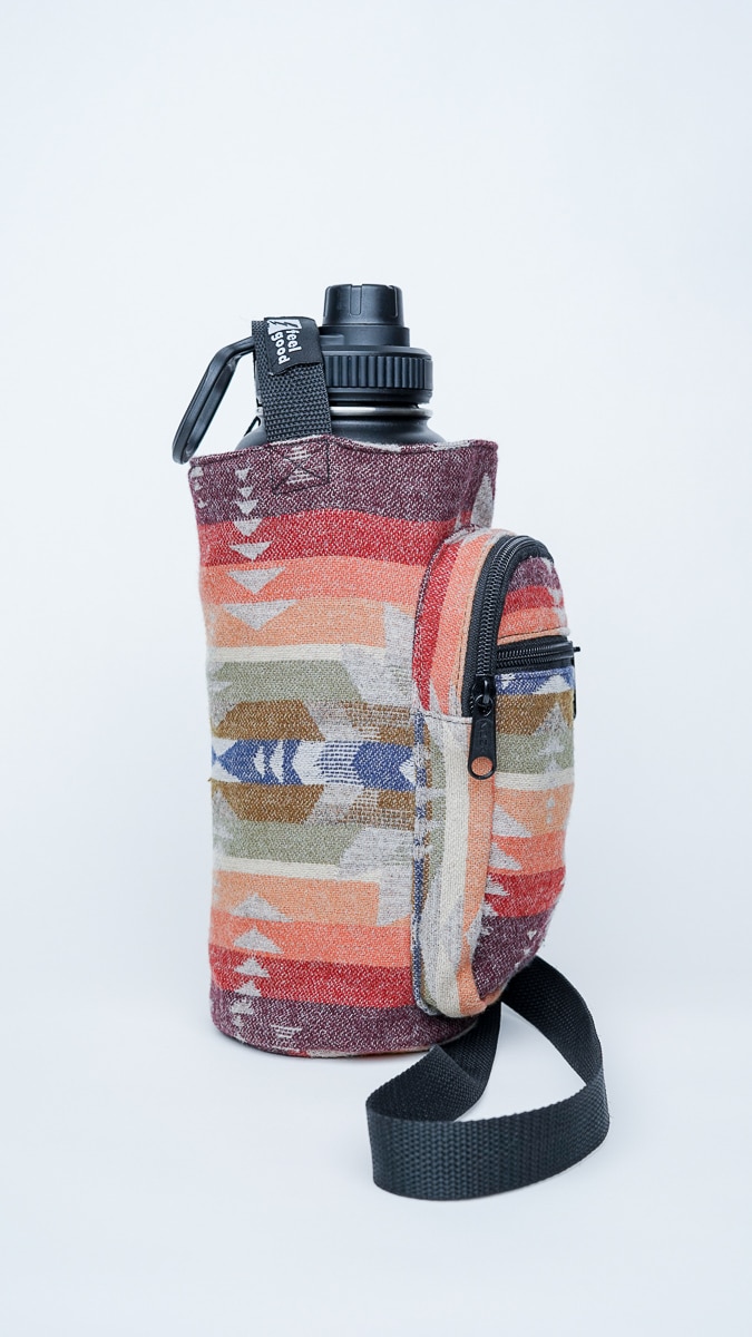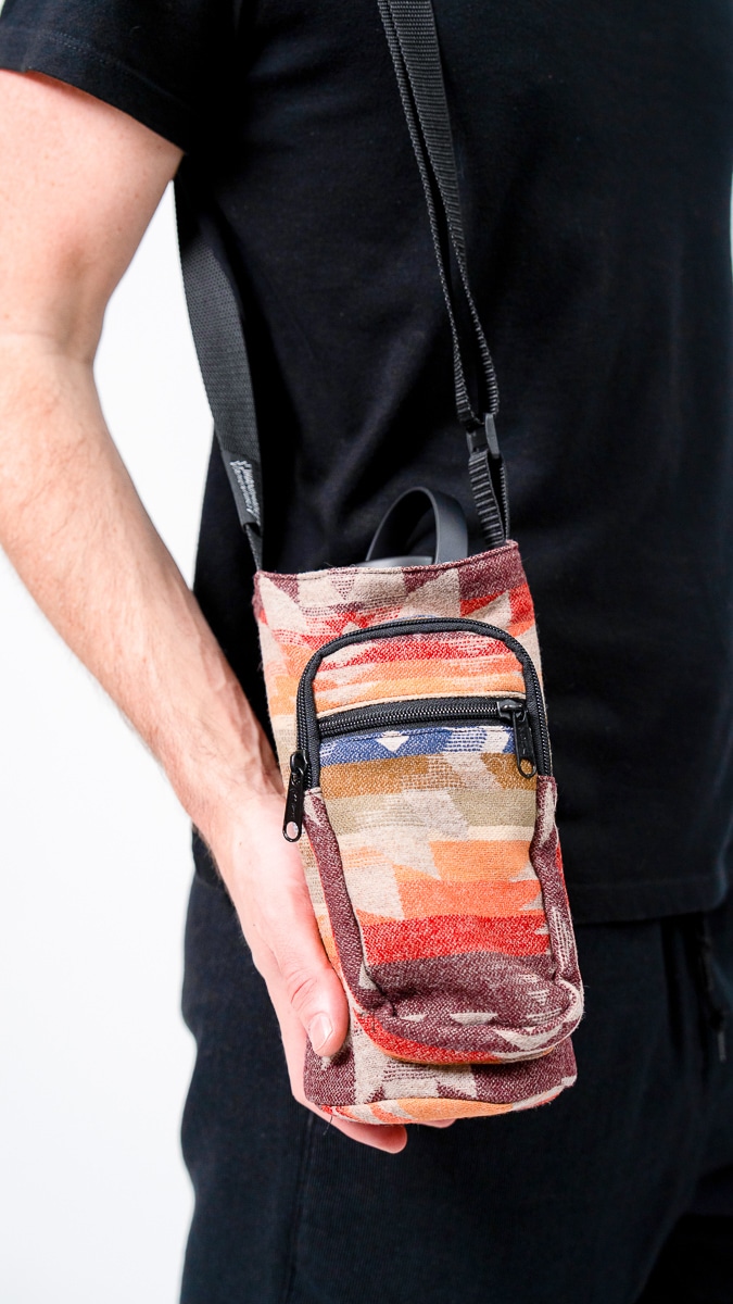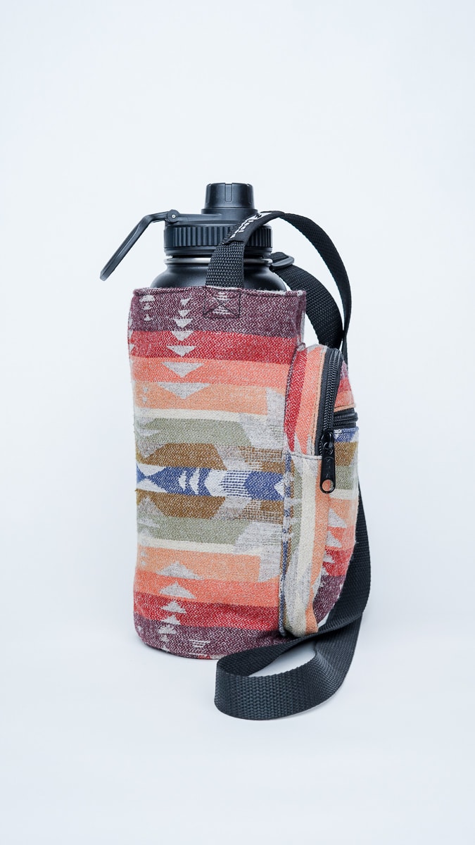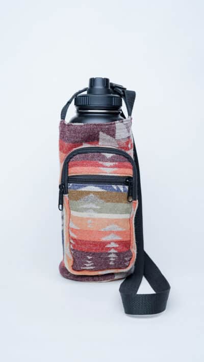 This bottle holder features rich tones of clay, sandstone, sage, and burgundy in a one-of-a-kind woven pattern. Each one is individually cut and sewn, meaning the design you receive will be completely unique, like a landscape shaped by time.