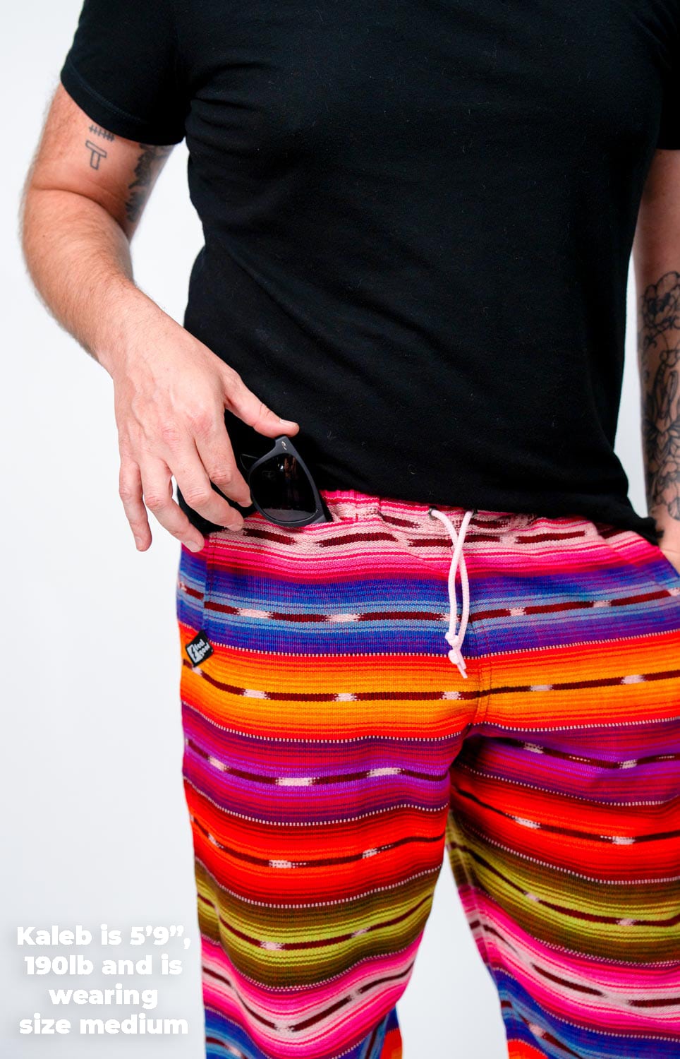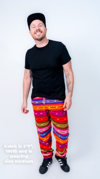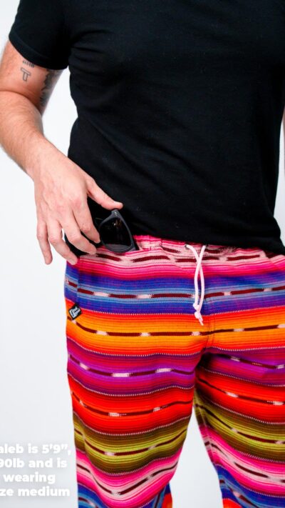 Feel Good Pants are crafted from a breathable, handwoven 50/50 cotton-acrylic blend sourced from artisan cooperatives in Guatemala. The fabric is soft, durable, and naturally odor-resistant — perfect for lounging, travel, or off-grid adventures. No two pairs are exactly alike, thanks to the slow art of foot loom weaving. These handwoven rainbow pants break in like your favorite jeans, only more comfortable. They’re made to move, made to last, and made to mean something.